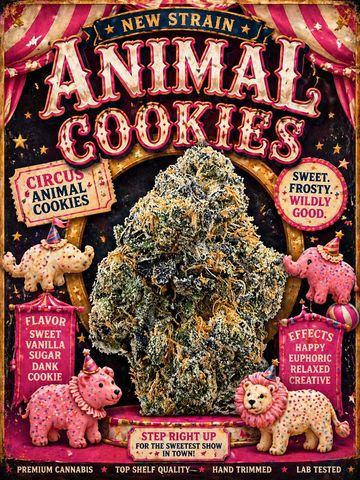 Animal Cookies is an indica dominant hybrid strain (75% indica/25% sativa) created through crossing the infamous Girl Scout Cookies X Fire OG strains. This celebrity child is a favorite of both patients and breeders, packing a super stable grow and a hard-hitting high. The Animal Cookies high comes on fast and hard with a rushing lifted feeling that fills your mind with a happy and unfocused euphoria